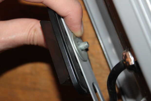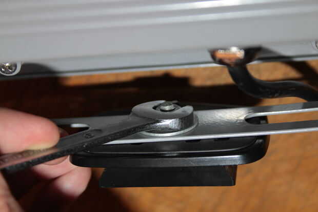 Coloque la placa de montaje de la obra luz sobre el tornillo M5, poner una arandela y la tuerca M5 sobre ella y apretar con una llave. Puede ser que necesite contrarrestar el tornillo con otra llave o unas pinzas. Usé mis manos, funcionados bien.