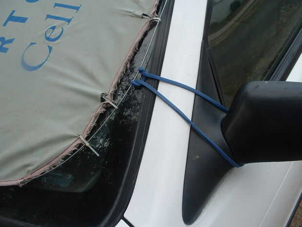Aquí vas a ver otra foto del lado del coche con las bandas de goma alrededor del espejo. Yo uso esa misma cosa en ambos lados del coche. Con las bandas de goma es sólo una cuestión de desengancharlo dan la ventana ciega un flip e ir a otro lado y lo desconecte y estás listo para guardarla. Sólo lo pongo detrás de una mesita que tengo cerca el coche. Así, no tengo que desbloquear nada. No creo que alguien quiera robarlas. JAJAJA