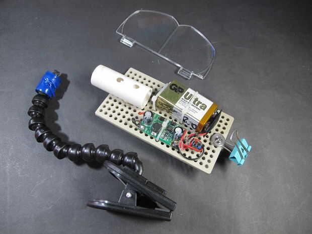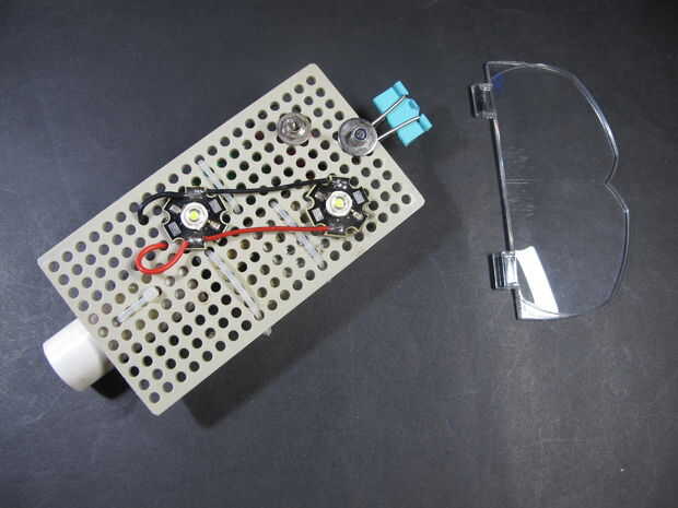 Tengo un trozo de placa universal (modelo plástico de TAMAYA), dos 1W alta potencia LED, controlador de LED, batería de 9V y un interruptor para hacer la lámpara.
