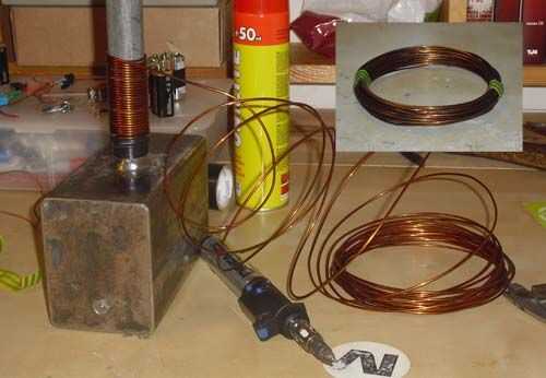 1. referir a mi idea inicial para hacer rayas de cobre decoración en el mango, comencé a 8,8 metros de alambre de 2 mm en forma de prebenda. Use cinta para fijar su punto de partida.