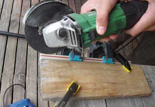 7. para hacer el canal utilicé una amoladora. Reloj hacia fuera para las manos y mantener el objeto de trabajo fijado correctamente. Dos mordazas para madera estabilizador, dos para el tubo. Usé la línea roja en el tubo para mantener recto el canal más largo, más corto que el interruptor fue a mano alzada.