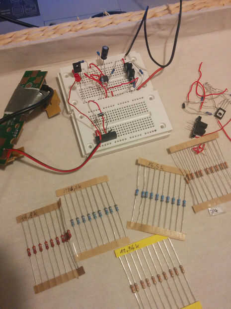 La segunda imagen muestra el circuito entero v3. Había intercambiado accidentalmente C1 y C2... esto tiene un efecto en el tiempo. Ahora necesitaba 100 veces más resistencia... algo así como 186kOhm. Algo bueno tenía estas resistencias impares alrededor:).