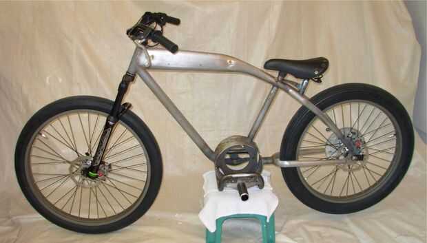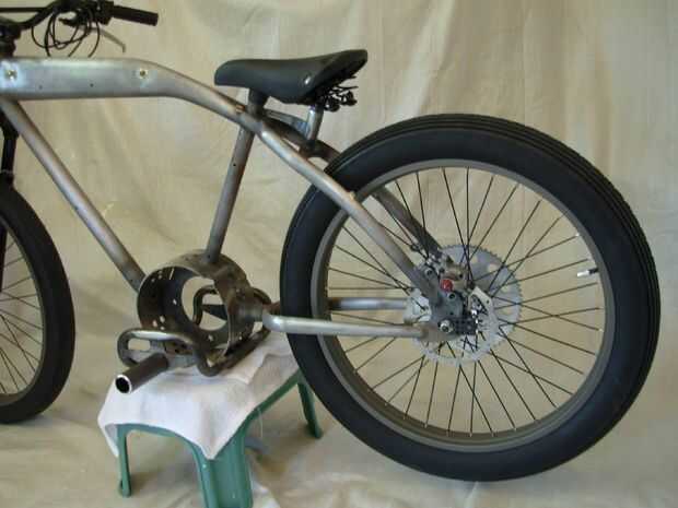 Aquí se puede ver la moto que se unen. Las ruedas carnosas y la posición de silla de montar inferior le dan un aspecto retro. Note que el soldado en ojales para la encaminamiento de cable del freno trasero.