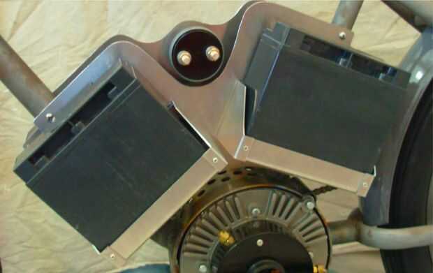 Las bandejas batería fueron fabricadas con culata de aluminio. Cada bandeja fue remachado juntos y atornillada al panel derecho e izquierdo. Luego se atornillan los paneles a cada lado del marco. Tenga en cuenta el interruptor de encendido en el centro. Los paneles izquierdos y derecho son asimétricos a aceptar los terminales en la parte posterior del interruptor. El regulador está montado boca abajo debajo del tubo superior con los terminales apuntando hacia atrás.