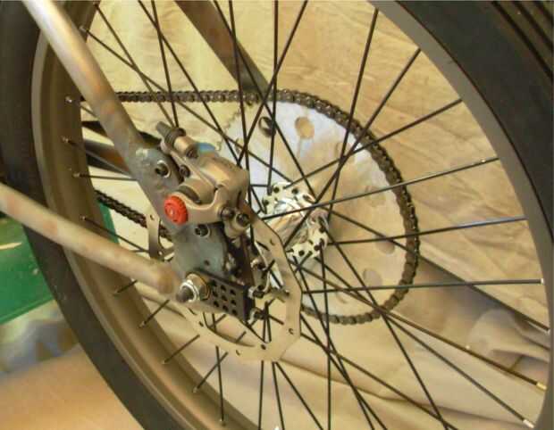 Aquí es soldar el soporte de freno, las ruedas han sido atadas a los centros y a la derecha, la estancia del asiento ha sido prensada para obtener la separación de la cadena y el piñón. Los tensores de eje que eran de productos de la respuesta.