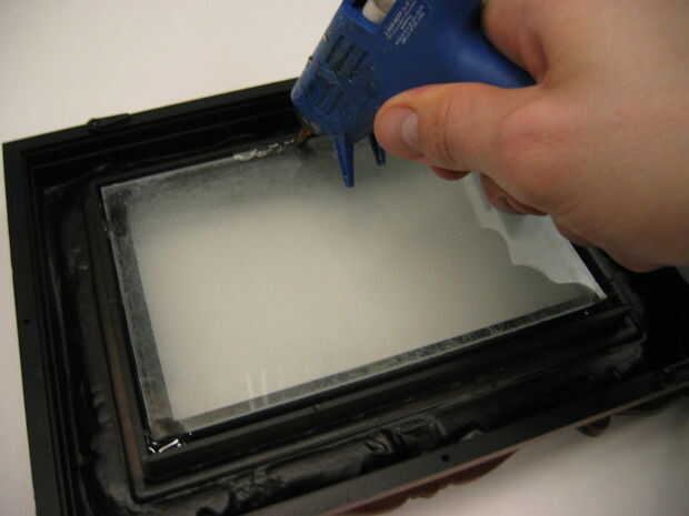 Utilice una pistola de pegamento caliente para fijar firmemente el vidrio a la estructura. Si su vidrio es helado, asegúrese de que el lado mate es hacia fuera (es decir, el vidrio se siente áspero al tocar desde el lado bonito del marco).