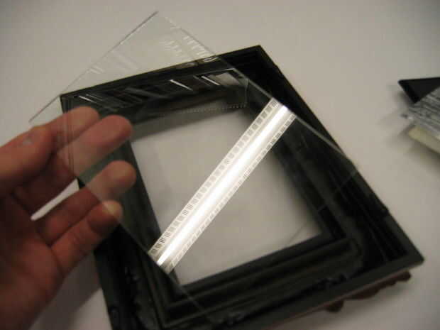 Retire la parte posterior del marco y quite la placa de vidrio. Opcionalmente, en este punto se puede lijar un lado del vidrio con papel de lija especial vidrio/diamante (Nota importante: Si usted arena vidrio, use agua para reducir el polvo de vidrio que puede ser peligroso para respirar) para difundir la luz y hace el cristal look helado. Papel de lija estándar debería funcionar también, pero llevará mucho más trabajo.