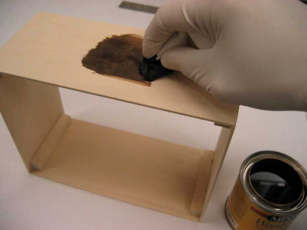 Finalmente, la arena y la casilla para que la estructura de la mancha. En este caso, una mancha de color nogal oscuro se utiliza para hacer el tilo barato aspecto lujoso.