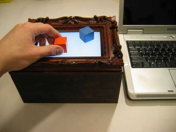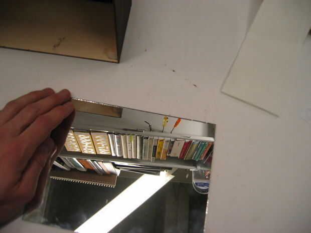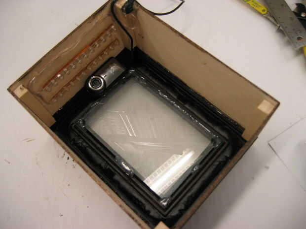 Coloque un espejo de 4 pulgadas x 6 pulgadas sobre la mesa y ponga la caja en la parte superior. Este espejo Active la webcam apunta hacia abajo en realidad mirando la superficie de cristal del marco (alternativamente, la cámara web podría han sido montada directamente en la mesa mirando para arriba el vidrio, pero la caja tendría que ser dos veces tan alto, lo que es incómodo de usar y voluminosos).