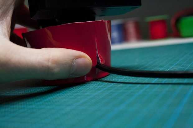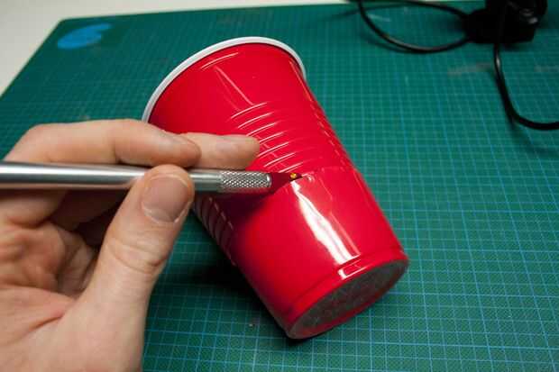 3. empuje de un pequeño agujero en la parte inferior de la taza de plástico. El agujero debe ser lo suficientemente grande como para poner el cable de webcams a través de.