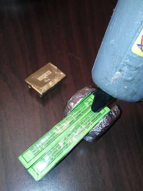 Pegue un bloque de Hershey Nuggets boca abajo entre los neumáticos traseros del"". Se vería mejor de lado derecho pero no hay suficiente espacio.