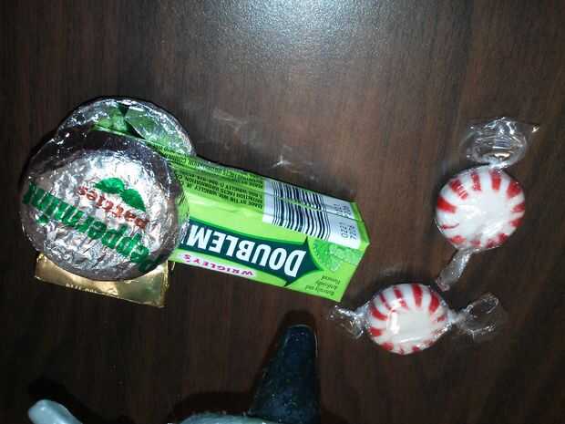 Pegar una menta roja y blanca a cada lado de la encía cerca de la parte delantera del tractor. Posición para que la envoltura exceso va lado a lado y no hacia arriba y hacia abajo.