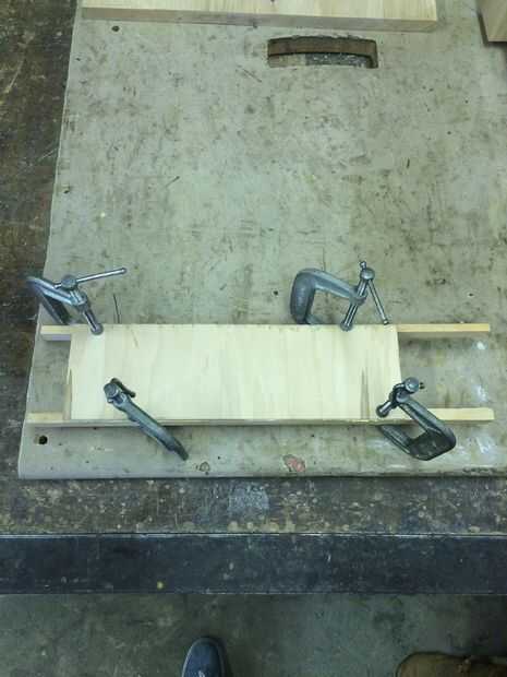 Tomar los dos flacos palos y pegarlos debajo de la grande. No es opcional, pero usamos c abrazaderas para mantener la Junta pegada para que no caiga aparte.