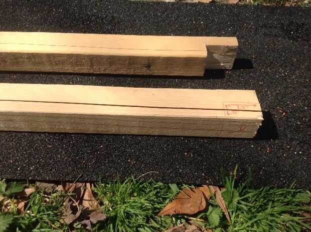 C 4 y dos de las vigas se debe cortar por la mitad, pero en un ángulo de 60 grados para acomodar el hecho de que se sientan en 60 grados de ángulo en la parte inferior 2 "x 4" s (dejando cuatro secciones 4'). El otro extremo también debe cortarse a 60 grados en la dirección opuesta para asegurar que cumplan al ras en un punto en el vértice de la estructura. Finalmente, se deben cortar las puntas apex y opuesto 60 grados 1.5 pulgadas vuelta juntas para que puedan sentarse en uno a. Este es el corte más difícil. Ver 1 empalme de regazo para un estrecho en imagen conceptual. La sección oscura indica una vuelta visible, mientras que su pareja está en el lado opuesto en la otra viga. Hacemos esto para permitir que un solo tornillo pase a través de este empalme de regazo y el rayo más largo en una sola toma. La longitud final de la tabla debe ser apenas tímida de cuatro pies, como perdemos una pequeña parte a la creación de las juntas angulares. Si tienes problemas para conseguir los ángulos parecen correcto, tratar de trazar las piezas caerán y con los ángulos que tienen en esa posición como punto de referencia.