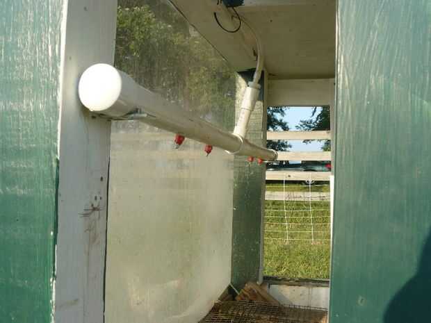 El sistema de la cooperativa consiste en poner un cubo de gatos en el techo de la coop. He instalado a un adaptador a la parte inferior de la cubeta que se hace para caber un tubo de vinilo. El tubo de vinilo se alimente por instalación de tubería de PVC. El tubo de vinilo conecta a un conector dentado que se atornilla en una conexión en t para el tubo de PVC. Dos secciones cortas de PVC se insertan horizontalmente la t y cada una de estas secciones están capped entonces. Cada una de estas pequeñas secciones tienen dos pezones de pollo enroscados en él.