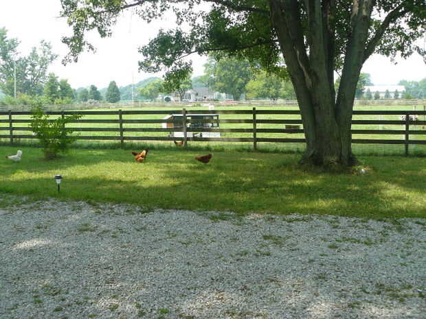 La cooperativa se utiliza en un campo de 3 hectáreas rodeado por vallas de caballo. Los pollos comparten este campo con 2 cabras Boer y uno francés alpino. La esgrima mantiene las cabras en pero no las gallinas. El gallinero real está rodeado por una cerca de malla eléctrica accionado solar de 164 pies. Este cercado eléctrico fue utilizado originalmente para mantener las cabras en un área específica en el campo antes de la valla de caballo entero se hizo prueba de cabra. Ahora utilizamos la valla para rodear el tonel de tractor, no para mantener los pollos pero para evitar depredadores. Sólo se enciende cuando no hay seres humanos alrededor. Cuando esto sucede, los pollos también se fabrican en la cooperativa. La valla no protege a los pollos de halcones. 14 gallinas en el gallinero es un trabajo de 2 personas porque las gallinas vagan por la propiedad, incluyendo fuera de las 3 hectáreas de pastoreo. Parece que se acostumbre a la rutina.