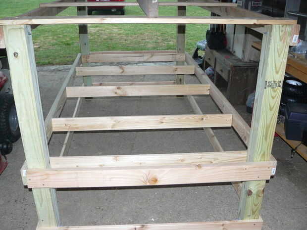 Ya que soy algo así como un carpintero klutzy, decidí ir con una estructura básica que era fuerte y perdonar errores. Quería algo que fuera lo suficientemente fuerte y lo suficientemente rígido como para que pude colgar cosas en ella. Decidí a cuatro 4 pies presión larga 4 x 4 tratada de servir como los postes esquineros. Estos fueron conectados entre sí por 2 x 4 y 1 x 4. Tableros de conexión determinan el largo y ancho de la coop. Ya que yo estaba rodando la Max 14 pollos de la casa, hice estos tableros de conexión ya sea 8 pies para la longitud o 4 pies de ancho. Uniendo todos estos junto con tuercas y tornillos, pude obtener una estructura muy rígida. Con eso en su lugar, pude añadir lados, una planta principal, una caja de nido, un techo y ruedas.