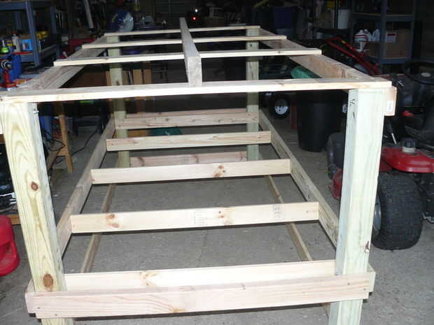 4. Fije los marcos laterales junto con 2x4s a 46 pulgadas (48 pulgadas causará problemas más adelante). Ignorar el hecho de que no usé un 2 x 4 en la parte superior de los lados. Si tuviera que hacerlo de nuevo, lo hubiese hecho de esa manera. Probablemente debe utilizar tornillos para fijar estos 2x4s a los postes. He usado tornillos pero funcionó en problemas constantes con los tornillos de ser despojados. Con tirafondos, puede apretar con una llave. Usted tendrá que perfore previamente los orificios para los tirafondos.