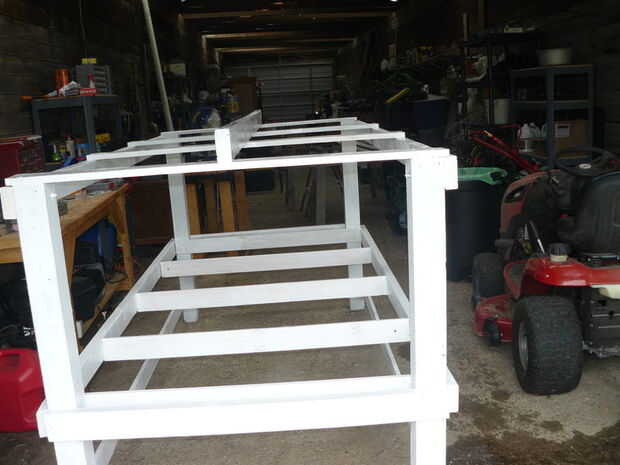 1. la planta de la cooperativa será media pulgada paño de hardware soportado por abrazaderas. He utilizado cinco 1x4s cortar para caber comodamente en el lado 2x4s. Estas placas deberán estar orientadas verticalmente para mantener el piso rígido. Pretaladrado de fuera la 2x4x en los extremos de la 1x4s que podía usar tornillos para sujetar cada tabla en su lugar. La primera y la última de 1 x 4 también se puede conectar en el interior de los postes esquineros. Los otros tres deben ser espaciados uniformemente.