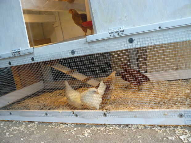 Originalmente había puesto una puerta corredera en un extremo de la cooperativa hacia abajo en el nivel inferior. Esto me pareció una buena idea pero la puerta mantuvo pegado conmigo y finalmente se deshizo de él y lo reemplazó con tela metálica. Cuando permitimos que los pollos hacia fuera de la cooperativa a correr, simplemente abrimos la puerta más cercana a la escalera en el piso y vienen streaming por la escalera y de la coop.