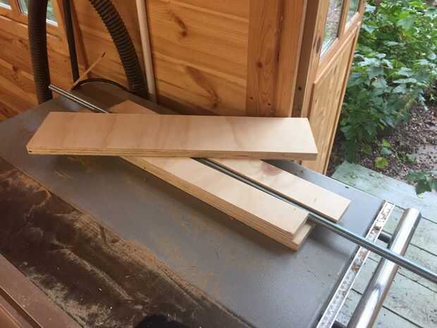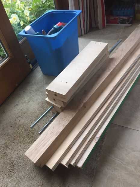El axel es 16mm y tuve algunos contrachapado de aproximadamente el mismo grosor por lo que era un simple caso de atornillar una tira de capas a una pieza más ancha, colocar la varilla roscada a su lado y atornille una segunda tira de capas para crear un sándwich de capas/barra/capas. Una cuarta y última pieza de capas completa el anillo. Para mayor resistencia los tornillos pasó por todas las piezas de madera. Estos no iba a doblar o estirar este tiempo...
