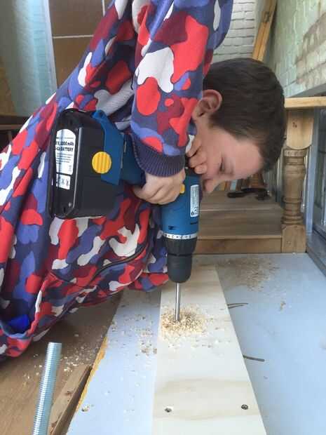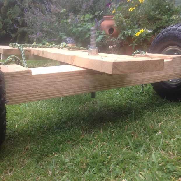 El sobrante de varilla roscada se convierte ahora en el fulcro de la dirección. Para perforar un orificio a través de la Junta del marco central y por rodear el segundo eje, un poco de ataques y tenemos la dirección fija en su lugar. Controles simples, ponga los pies en la madera, presione izquierda y girar a la izquierda, empuje derecho y a la derecha. Un par de tuercas tiene todo en su lugar.