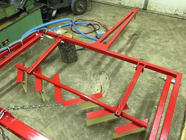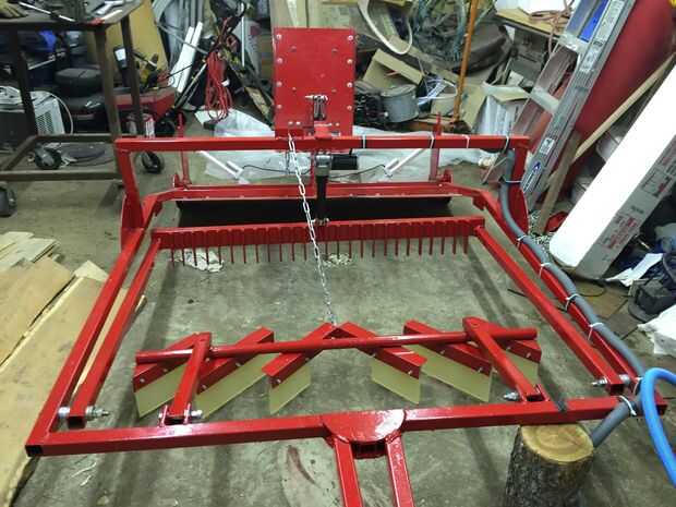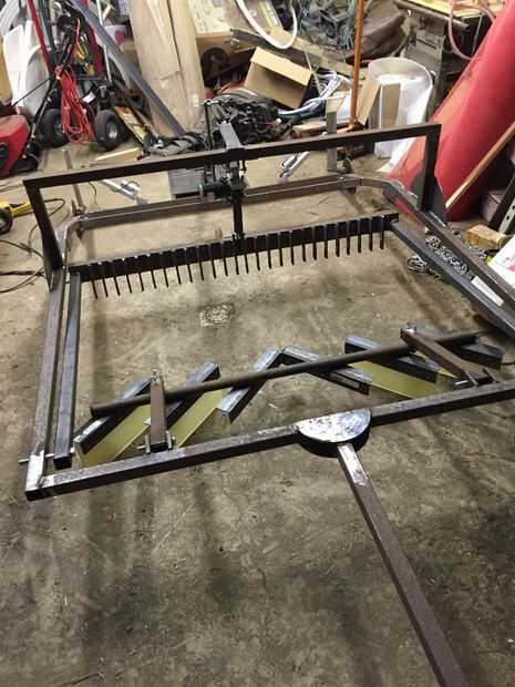 Para hacer la nieve reunión bar corte un trozo de tubo de 1 1/4 de pulgada a 51 en. 6 piezas de 1 1/2 en ángulo de hierro 12 en largo a la tubería de 45 grados de soldadura. El hierro ángulo cumple y está soldado en la línea de centro y en el orificio de 1/4 perforar allí para colocar la cadena. Los extremos del hierro de ángulo deben cortarse incluso con el extremo del tubo para que la Asamblea se ajusta dentro de la barra de acondicionador. Las paletas se son de 1/2 en poliuretano y atornilladas en ángulo de hierro con tres 1/4 de los pernos. Corté 6 pulgadas por 12 pulgadas rectángulos para las dos tiras externas. El interior dos son 6 X 6 pulgadas que sale 1 pie de espacio en el centro de la nieve se acumule. Una pieza de 4 pies de cadena ligera adjunta a las tiras medianas desliza en una ranura en la parte superior del arco para ajustar la altura de las paletas. El tubo con las paletas se suelda con autógena a dos 19 1/2 en trozos de 1 1/2 en tubería cuadrada que se anexan a las lengüetas soldadas en el interior de la parte delantera del bastidor con 1/2 tornillos. El exterior son 10 situado en el interior del sostén lateral.