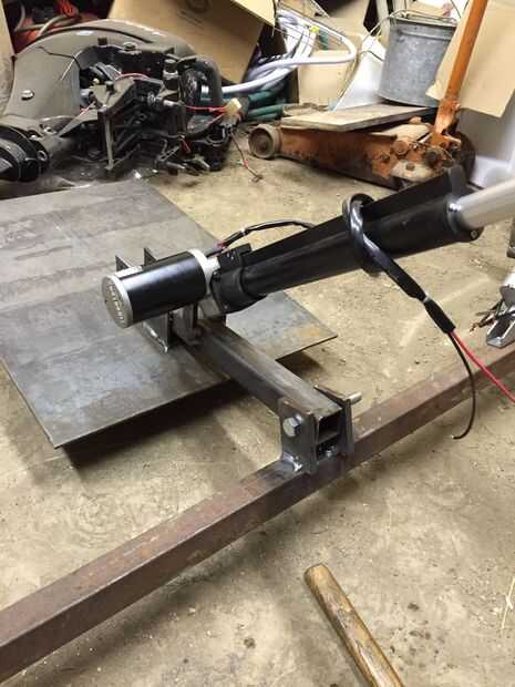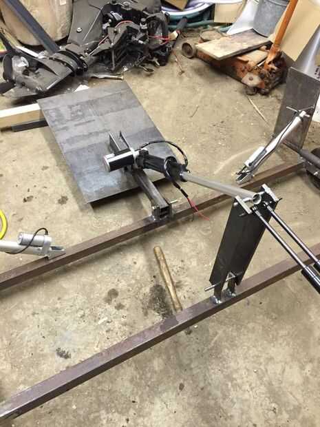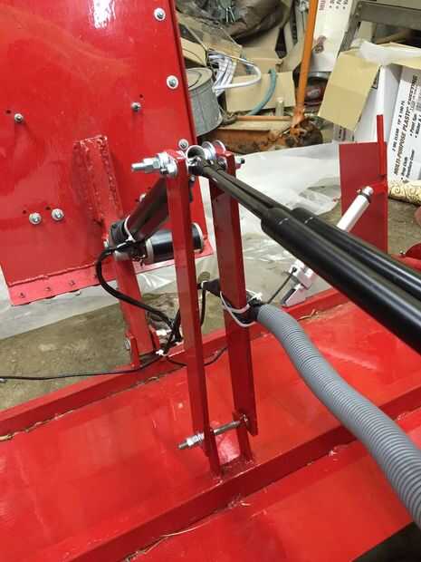 El perseguidor es presionado sobre la nieve por la acción combinada del actuador lineal y dos cilindros de gas de 100 lb (el tipo usado para casquetes de automóviles). Cuando el actuador lineal se extiende y el tracker está en la posición hacia abajo debe la caída de peluquero en una depresión que el tracker comprimirá los cilindros de gas para permitir que el tracker flotar para arriba y permanecen en contacto con la nieve sin doblar o romper cualquier cosa. Los cilindros de gas que compré fueron 19 en largo. En el frente se fije a una extensión de soldado con autógena del centro detrás del arco y en la parte trasera a dos 16 de largo 1/4 en 2 en puntales de acero que en la Cruz pedazo de 18 en la parte posterior del marco. (ver fotos) El actuador lineal se adhiere a los orificios en la parte superior de las costillas justo detrás de los orificios de los cilindros de gas. Usé un actuador de 11 1/2 en 650 lb que me dio herramienta norte. Usted necesita obtener su actuador y gas cilindros y puntales verticales todo en su lugar con el rastreador de sistema plano para determinar la longitud de la extensión detrás del arco. En mi caso era 12 pulgadas. Puede ser diferente para usted dependiendo de cómo todo se alinea.