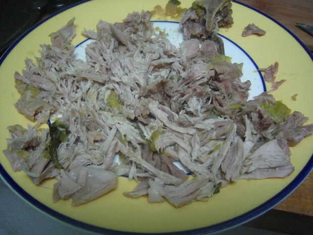 Sacar la chuleta de cerdo de la cacerola y desmenuzar la carne. Retire cualquier huesos.
