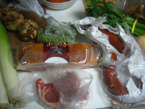 Esta sopa está repleta de carnes. Específicamente: carne de cerdo. La losa de tocino, cortado en trozos; una hueso de chuleta de cerdo (o pies de cerdo, tradicionalmente) y holandés "ajedrea", una salchicha ahumada. Se puede sustituir uno de ésos Kielbasas selladas al vacío para la Ajedrea, o mejor aún, un fresco Kielbasa de su pulimento local carnicero.