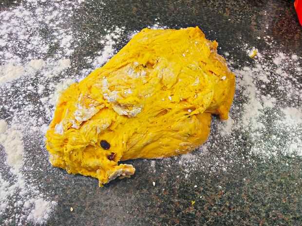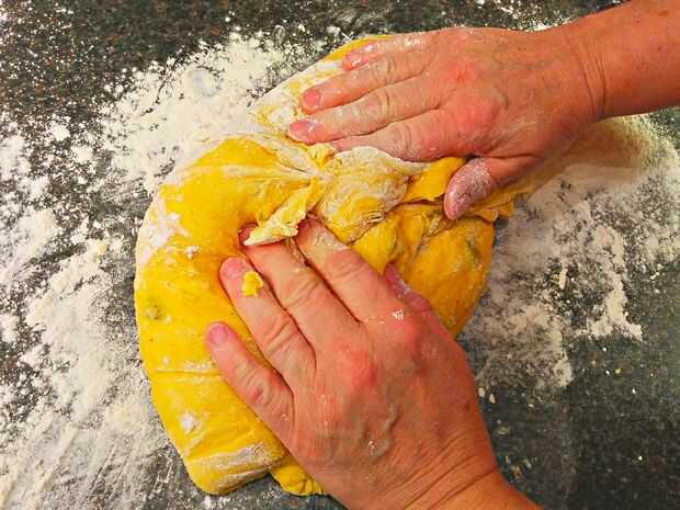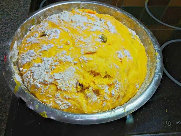 Una vez levantado, poner la masa en una mesa de trabajo enharinada y amasarla.