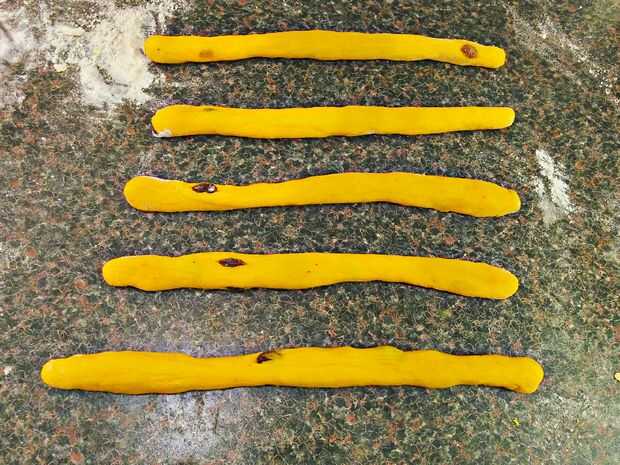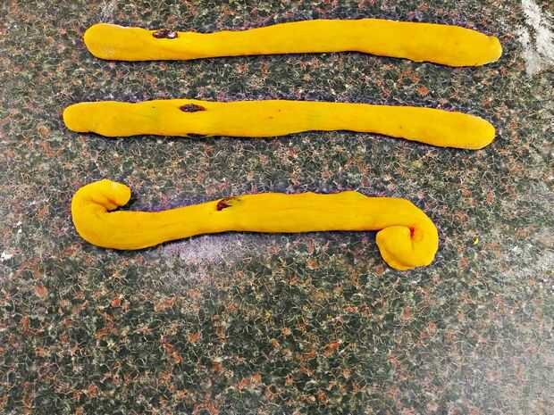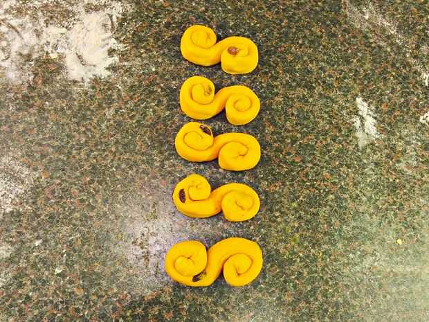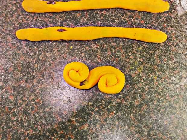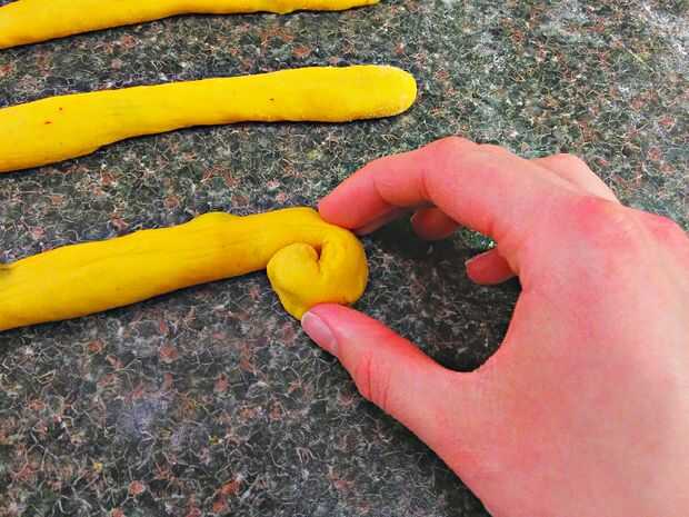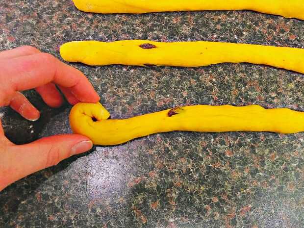 Otro método es hacer un tipo de pretzel. Empezar por rodar hacia fuera un pedazo de la masa en una larga serpiente. En un extremo, girar la torcedura en una derecha de caracol. Otro extremo, girar la torcedura en una izquierda de caracol. Continuar hasta que se encuentran en el medio.