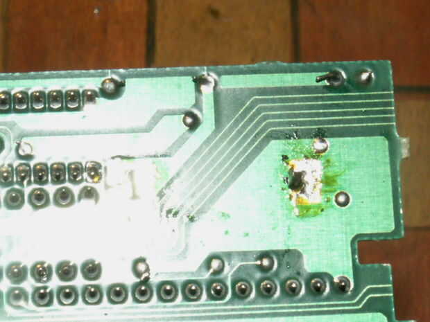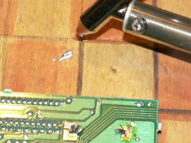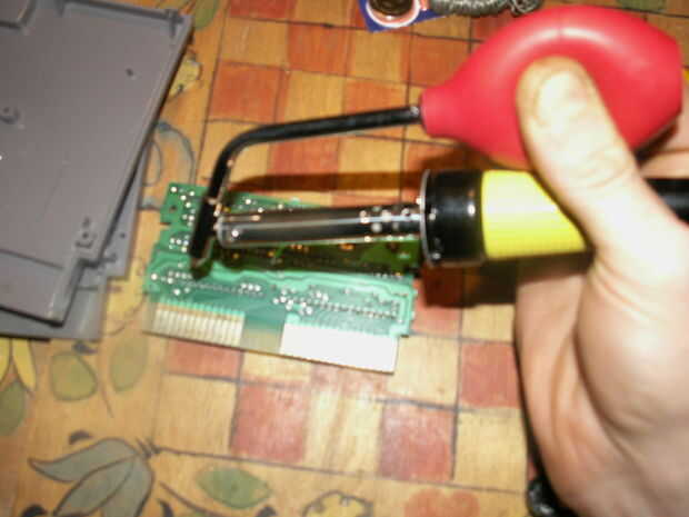 Utilicé un soldador de, así que usted calienta a exprimir todo el aire de la bombilla y una vez que el estaño esté líquido aspirar, y luego golpe caliente de la soldadura de nuevo sobre otra superficie no la placa de circuito, utilizo una tabla de madera para hacer mi soldadura.