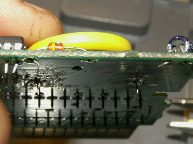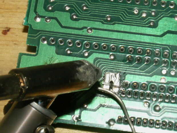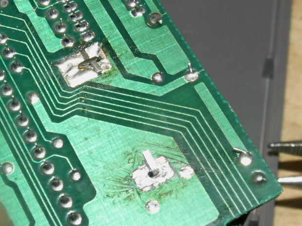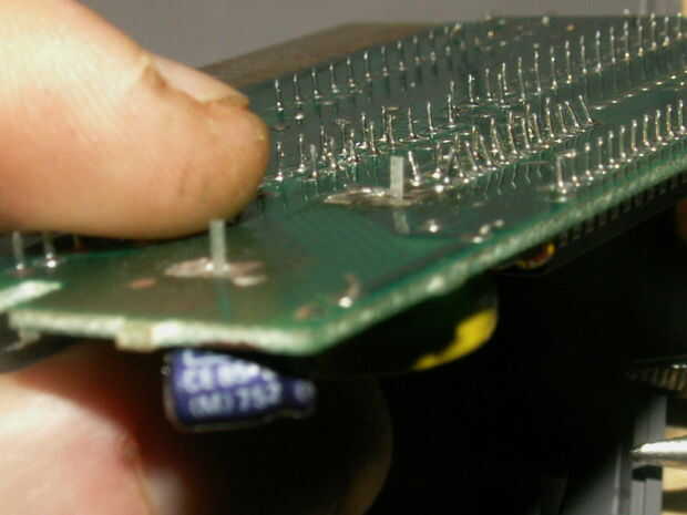una vez que los pernos a través de los agujeros, sacar tus pinzas. y doblar las patas hacia abajo sobre el tablero. Luego calentar la pistola soldadura piscina alittle soldar y trabajar en su lugar, cubriendo el perno entero.