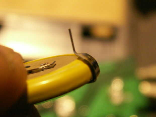 Así que ahora he utilizado unos alicates de punta, doblar hacia abajo en una L para compensar el 1 o 2 milímetros necesitan para encajar en el agujero del circuito. Esto funcionó mucho mejor y luego los clips de batería he intentado antes.