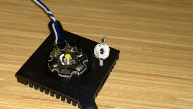 Recientemente mi padre utiliza 12V taladro inalámbrico batería para matar a dos de mis LEDs de alta potencia de 3W. Por supuesto él me compró nuevos, pero sin el disipador de calor... Así que tomé mi soldador y trató de desoldar quemado LED reutilización del disipador de calor... pero al parecer estaban pegados en el disipador térmico con pegamento de calor para no desoldarlos. Tomé el destornillador y probado para el LED. Sólo fui capaz de romper la cáscara plástica de outter. Entonces descubrí que puedo hacerla brillar otra vez!