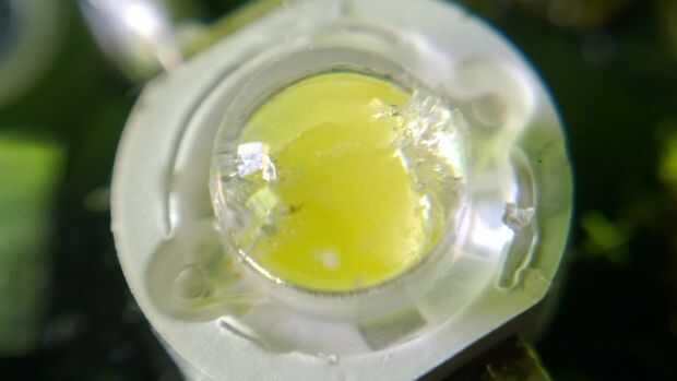 Durante mi investigación sobre LEDs he encontrado que el material utilizado en este diodo parece ser nitruro de galio, utilizado en LEDs desde la década de 1990 es más eficaz que el carburo de silicioy da mucho más luz. Utilizando nitruro de Galium combinado con aluminio o indio en LEDs podemos lograr diferentes colores de rojo a violeta ultra, si tienes Blu-ray en tu casa también tienes nitruro del galio basado en láser que lee el disco de Blu-ray ;)