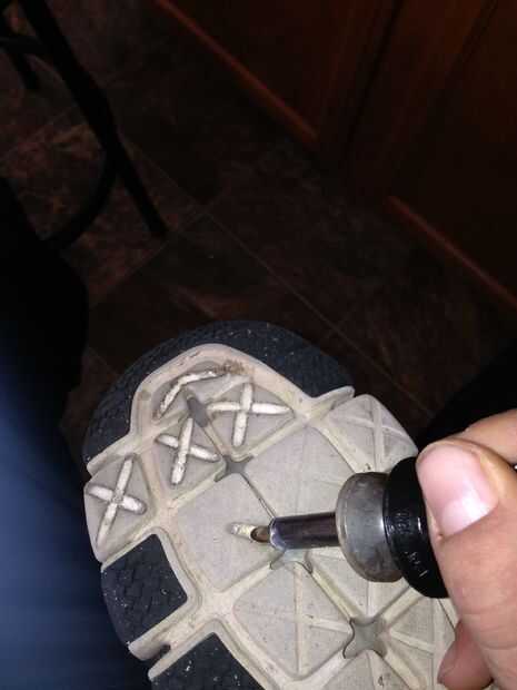 Después de encontrar un área con ventilación, une la punta adecuada que partidos cerca existente banda de rodadura marcas. Enchufe la herramienta y deje que se caliente. Una vez caliente, trabajar la banda de rodadura en el zapato. No hundir la planta del pie, irás pensó el zapato entero, y no quieres que.