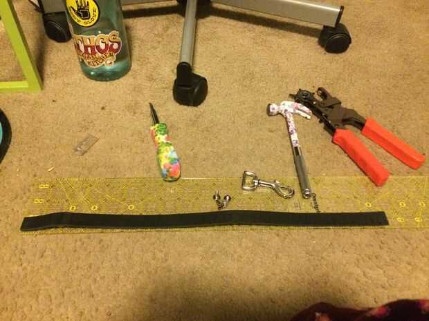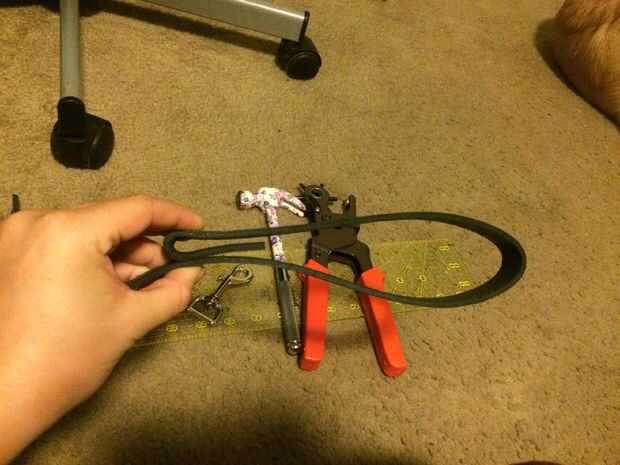 Tenía donde yo quería cortar el cuero para acabar el bucle (guardo un espacio de 1/2 pulgadas del extremo cortado al final del bucle pequeño, donde se fija el mosquetón. Esto no es necesario, solo creo que le queda con el espacio)