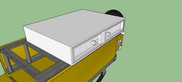 De todos modos, hemos soldado esta caja directamente sobre la estructura interna. Ahora puedes ver por qué los miembros de la Cruz fueron espaciados como estaban. Hemos decidido que los cajones hacia el lado del pasajero para que si nos paramos en el hombro de la carretera para conseguir algo no se destacando en tráfico cuando lo abrimos. Montamos la caja lo suficiente a la derecha que sobresalga un poco, el riel de cama para impedir que la lluvia se canaliza en.