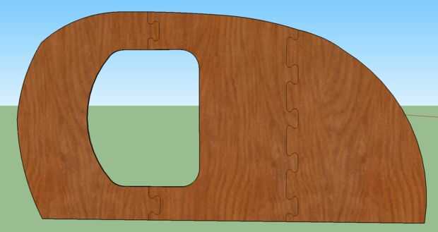 Después de hacer algunos tutoriales de Sketchup, diseñé el general trailer lágrima en Sketchup incluyendo las paredes laterales. Una vez que estaba feliz con el perfil, partí el flanco en tres piezas que fueron de menos de 4'x 8', utilizando un conjunto de rompecabezas que hice usando algunos círculos. Las paredes laterales están hechos de madera contrachapada de 1/2 pulgada y se cortan de las hojas de 4 x 8 de madera contrachapada barata como son piel en ambos lados por lo que no es necesario mirar bastante. Se adjunta el archivo de sketchup.