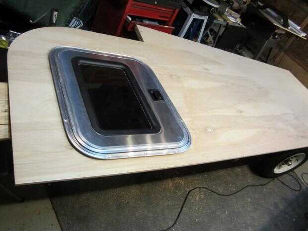 Primer las buenas noticias: la cúpula de repuesto para la ventilación Fan-Tastic sólo vino y no tiene grietas. ¡ Hurra! Prepárate el piso para el apernado a la estructura del remolque:- Colocar el marco de madera en la parte superior del remolque, afianzado con abrazadera para permanecer en el lugar