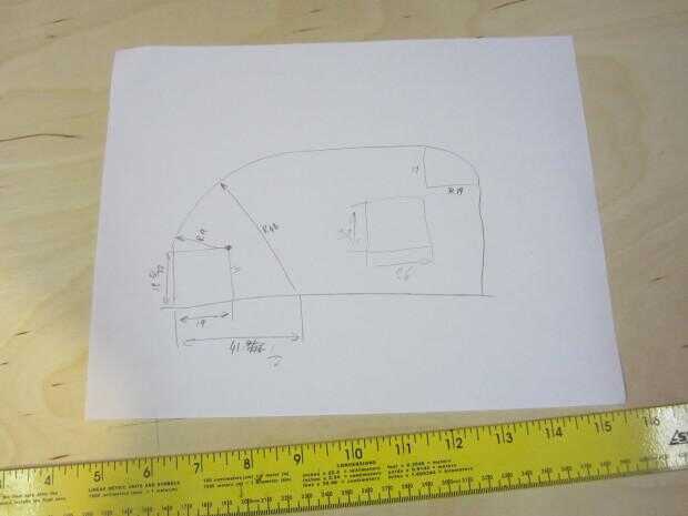 usé 2 brújulas caseras (sólo un trozo de madera con un clavo de un lado y un agujero para el lápiz en la otra). Primero uno es 19" largo de la uña a la punta del lápiz y uno es 48". La curva a la izquierda del papel (la parte posteriora de la gota) se hace de 2 círculos de arco, el primero tiene un radio de 19"(la 19" brújula) y la segunda 48"(la 48" brújula). Esto le dará a la curva en la parte trasera del remolque una forma de arco de la elipse. Nota: Ignorar la dimensión 18 5/32 en el dibujo, no usarlo, es la dimensión correcta para el arco de radio 19" 19" de lado y 19" de la parte inferior.