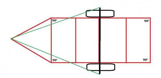 Para asegurarse de que el trailer es cuadrado, revise todas las esquinas para ser 90 º y, además, medida desde la punta de la lengua en el centro de las ruedas (las líneas verdes en la siguiente imagen). La medida debe ser exactamente la misma.