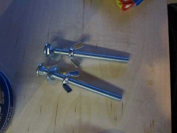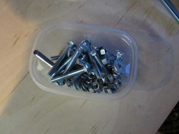 Los tornillos con arandelas, arandelas y tuercas que usaré para atornillar el marco de madera en el trailer: