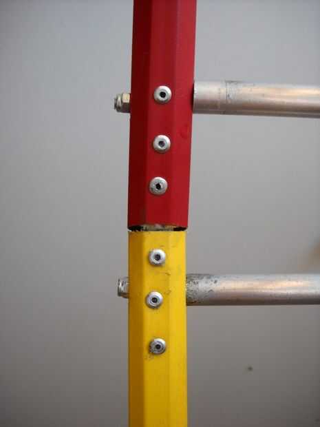 El siguiente paso fue encontrar una manera de conectar las piezas de palo de escoba, pero con un ángulo pequeño. Para eso usé dos trozos de pequeña (20 cm) de tubo de alluminum, cuidadosamente doblado insertando dos taladros en ella y forzar el centro contra un duro de la esquina con mis manos, en pequeños pasos, así bendend suavemente.