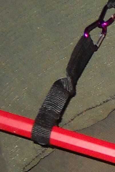 Ahora es el momento para conectar los palitos para mi cinturón con mosquetones. Utilicé tiras de nylon de la bolsa de la vieja escuela de mi hija. Una pieza de la banda de caucho negro de polainas de mi hija fue cosida en él para evitar la rigidez y un tornillo que fija el material a la escoba, dejando espacio suficiente libre para mis manos, en caso de que deba empujar o remolcar.