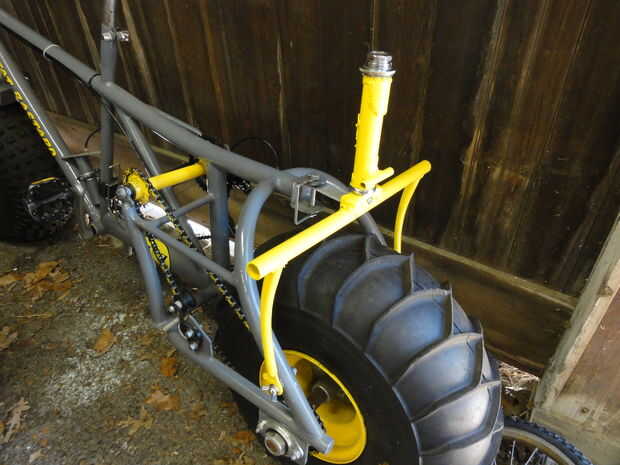 Usé el gris para que coincida con el marco de la bici y decidió pintar el nuevo centro y el amarillo de enganche horquilla para que coincida con los acentos en la bicicleta.