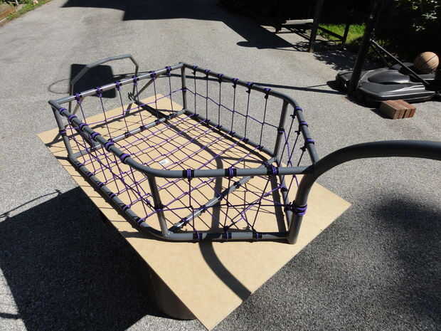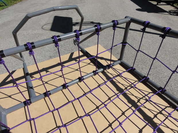 Até el cable a la baranda del lado superior del marco con lo que se refiere a una vuelta redonda y dos medios nudos, corrió el cable hacia abajo y en el travesaño, en la parte inferior de la zona de carga y luego hasta el lado opuesto, atarla a la baranda superior opuesta.