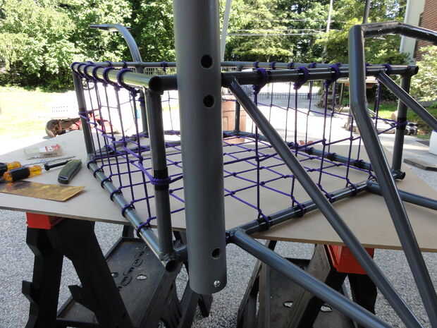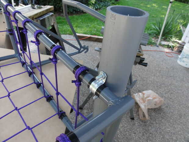 Cinta gorila fue utilizado una vez más para proporcionar una superficie vuelve pegajosa para el accesorio. La abrazadera EMT de 1/2" se presionó sobre el marco y el tornillo a los sujetadores de varillas de PVC con los tornillos de #10.